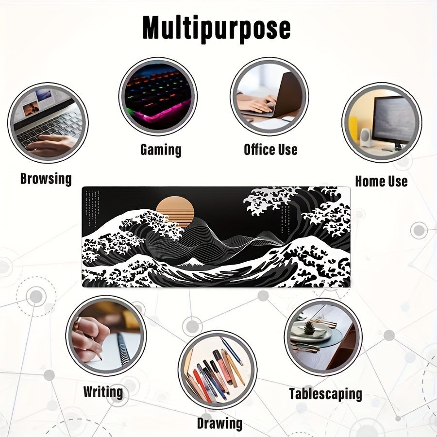 Large Extended Gaming Mouse Pad with Black Waves Design – Non-Slip Rubber Base, Vibrant Oceanic Artwork, Durable Stitched Edges for Gamers and Professionals, Gaming Accessories | Artistic Mousepad | Textured Surface, Mouse